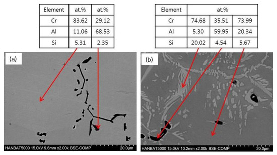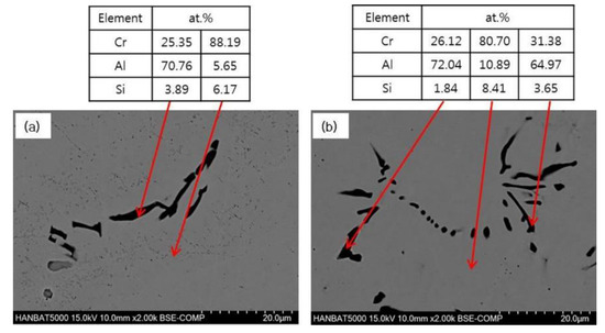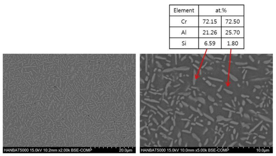 The microstructure of Cr–Al–Si alloys containing 10% or 20% of Al was observed and analyzed at higher magnification, as shown in Figure 2. Considering the literature and the EDS analysis results, the dark phase is assumed to be Al8Cr5 or Al9Cr4 [17]. Al9Cr4 phase is sometimes treated as an extension of the Al8Cr5 phase [15,18]. The maximum amount of Si dissolved in Al8Cr5 phase was known to be 5.6%, but an amount smaller than that, about 2.3%, was measured in this study [18]. Meanwhile, it was observed that a large amount of CrSi phase was formed, in addition to some AlCr phase in the alloy containing 20% Al, and the CrSi phase is considered to be Cr3Si, based on the literature and EDS analysis results [16]. It is interesting to note that, although Al content is further increased, the amount of AlCr phase is not increased and instead a large amount of CrSi phase is formed. This phenomenon is presumed to have occurred because the element of Si dissolved in the Cr matrix was released from the base due to the precipitation of the CrSi phase when the Al content was increased above a certain amount.