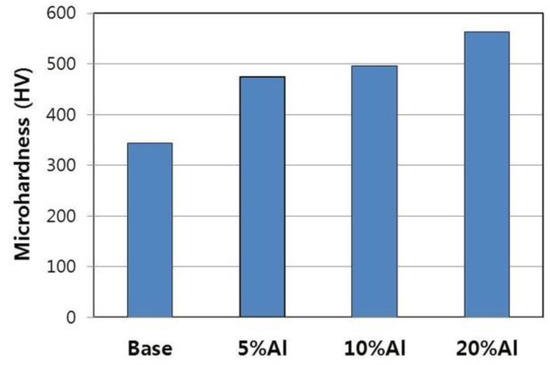 Figure 3 indicates that the micro-hardness of Cr–Al–Si alloys increases in proportion to the aluminum content. Since aluminum and silicon added as alloying elements are completely dissolved in the Cr–xAl–5%Si alloys’ matrix up to 5% Al, solid solution hardening seems to be the main reason for the increase in hardness of the 5% Al-added alloy. In the case of 10% Al-added alloy, the increase in hardness due to the formation of the AlCr phase may be added. A more significant increase in hardness was observed at 20% Al, which seems to be associated with the formation of Cr3Si phase. Cr3Si is a very hard phase, and the hardness of Cr3Si phase on VHN basis has been reported to be more than eight times that of Cr phase [19]. Since the Cr3Si is stable at high temperatures [11,12], formation of the Cr3Si phase is expected to improve not only the wear resistance but also the strength of the Cr–Al–Si alloys at high temperatures.