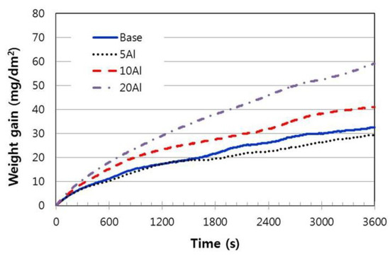 As indicated in Figure 7, when the oxidation resistance was evaluated based on the weight change, the increase of Al addition did not increase the oxidation resistance of the Cr–Al–Si alloys, but rather decreased slightly. The weight increase of 5% Al alloy was slightly lower than that of base alloy (0% Al), and those of other high Al alloys was apparently larger. When spalling occurs in the oxidation process, it is not accurate to evaluate oxidation resistance only by weight increase. On the other hand, the reason why the weight gain is higher in the high-Al alloys is believed to be partly due to the formation of alumina in addition to Cr oxide.