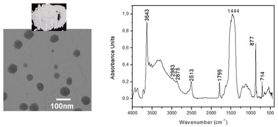 The produced nanoparticles were characterized using TEM and FTIR, as shown in Figure 1. According to the TEM image, the sizes of the produced particles were lower than 100 nm, indicating that particles at the nanometer scale were successfully produced. The FTIR spectrum shows characteristic peaks which lead to the identifications of the carbonate (CaCO3) and hydroxide (Ca(OH)2) compounds of Ca [,]. In particular, the bands at 1444, 877, and 714 cm−1 correspond to the three different elongation modes of C–O bonds, while the bands at 2983, 2875, and 2513 cm−1 are harmonic vibration of these elongation modes. The thin band at 1795 cm-1 is associated to the carbonate C=O bonds. The strong band at 3643 cm−1 is related to the O–H bonds from hydroxides [,].