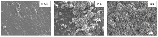The surfaces of the siloxane+Ca(OH)2 coatings were characterized using SEM. Indicative images are provided in Figure 2. Adding nanoparticles to the coating’s composition results in the formation of surface structures-protrusions that consist of siloxane material mixed with particle agglomerations. As the nanoparticle concentration increases, the surface protrusions become denser, thus promoting surface roughness. The latter is responsible for the extreme wetting properties, which are discussed in the next paragraphs. The scenario revealed in Figure 2 for the siloxane+Ca(OH)2 coatings follows the results reported previously for the effect of SiO2 nanoparticles on the surface structure of siloxane-based composite coatings [,,,,,,,,,,,]. Surface structures reported for siloxane+SiO2 coatings on marble [,,,,,,,,,,,] are similar to those shown in Figure 2 for the siloxane+Ca(OH) 2 coatings.
