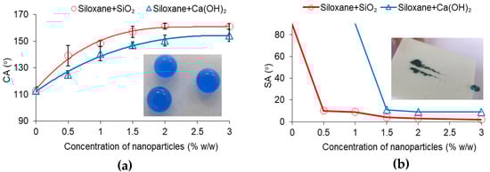 Figure 3 shows the results of the CA and SA measurements of water drops placed on the surfaces of the composite coatings on marble. Two sets of data are included corresponding to the coatings that were prepared using the produced Ca(OH)2 and the purchased SiO2 nanoparticles. According to Figure 3a, the CA of water drops on the surface of pure siloxane (without nanoparticles) is 113° ± 3°, indicating that the application of the water-based emulsion results in the formation of a coating, which shows hydrophobicity []. The results in Figure 3a show that CA increases with nanoparticle concentration and eventually becomes very large. Superhydrophobicity (CA > 150°) is evidenced for coatings that were prepared using concentrations of Ca(OH)2 > 1.5 % w/w and SiO2 > 1 % w/w. Overall, siloxane+SiO2 coatings gave larger CAs, compared to the results reported in Figure 3a for the siloxane+Ca(OH)2 coatings. This difference is within the experimental error for the coatings, which were prepared using the maximum nanoparticle concentration tested herein (3 % w/w), i.e., the error bars of CAs for the two coatings prepared with SiO2 and Ca(OH)2 nanoparticles overlap. The results in Figure 3a are in agreement with previously published reports that revealed the cross influence effects of particle size and concentration on the wettability of siloxane+nanoparticle composite films. In particular, it was shown that hydrophobicity is enhanced with (i) nanoparticle concentration up to a saturation point [,,,] and (ii) decreasing particle size [,]. In the results of Figure 3a, it is seen that CA increases with nanoparticle concentration reaching a plateau (saturation), which is clearer in the case of the SiO2 nanoparticles. Moreover, larger CAs are obtained with the siloxane+SiO2 coatings, as the SiO2 nanoparticles are one to two orders of magnitude smaller than the Ca(OH)2 nanoparticles.