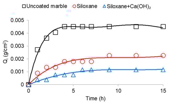 Amounts of absorbed water per unit area (Qi) as a function of treatment time ti, for three samples: (i) uncoated marble; (ii) marble coated by pure siloxane; and (iii) marble coated by a composite coating, which was prepared using siloxane and 3% w/w Ca(OH)2 nanoparticles (siloxane+Ca(OH)2). Data points were fitted with polynomial functions to guide the eye.
