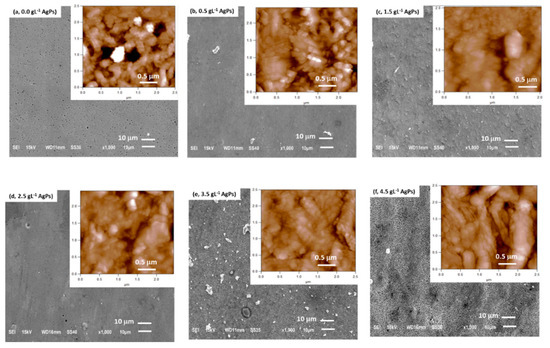 The influence of the concentration of silver particles (AgP) in the electrolytic solution on the morphology and elemental composition of the Zn/AgP composite coatings was studied by forming Zn/AgP composite coatings on AISI 1018 steel plates using S0 solutions with different concentrations of AgP (S0 + x g·L−1 AgP (x = 0, 0.5, 1.5, 2.5, 3.5 and 4.5)). The Zn/AgP composite coatings were formed by applying a current density of 8.5 mA·cm−2 for 60 min at 25 °C. The morphological characteristics of the coatings were analyzed by SEM-EDX and AFM and are shown in Figure 1. The SEM images show that the morphology of the coatings depends on the concentration of AgP in the solution. In the absence of AgP (solution S0) (Figure 1a) the obtained coatings were compact, smooth, with a roughness factor, Ra, of 0.65 mm; some micropores are observed on the surface (see inset of Figure 1a), due to the simultaneous formation of H2 bubbles by the simultaneous reduction of water during zinc deposition. By increasing the concentration of AgP in the electrolytic solution in the range of 0.5 to 2.5 g·L−1 (Figure 1b–d), the Zn/AgP composite coatings that forms are more compact and formed of semi-spherical clusters (see insets of Figure 1b–d), with a significant decrease in the number of pores. This result is attributed to the partial inhibition of H2 evolution by the blocking effect of some active sites by the adsorption of AgP; in addition, the roughness of the coatings increased from 0.69 to 0.81 µm, respectively. An important change in the morphology of the coatings was observed when the coatings were obtained from electrolytic solutions with concentrations of AgP greater than 2.5 g·L−1. Zn/AgP composite coatings obtained from electrolytic solutions with AgP concentrations between 3.5 and 4.5 g·L−1 (Figure 1e,f) were smooth, with crystals oriented perpendicularly to the substrate surface, resulting in the formation of a needle-like surface morphology (see Figure S1, additional information). This morphology was similar to that obtained when polyethoxylated compounds were used as surfactant additives, e.g., PEG 8000 [33] and PEG 20,000 [34,35], for the formation of metal electrodeposits, this result confirms the action of the AgP on the substrate surface. The roughness measured in these coatings was 0.84 and 1.12 µm, respectively.