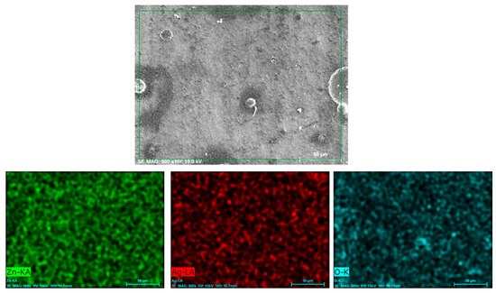 The elemental mapping analysis obtained from the surface of the Zn/AgP composite coatings presented in Figure 1d is shown in Figure 2. The EDX surface analysis of the coating detected the presence of Zn, O and Ag homogenously distributed on the surface. This detection confirmed the formation of the Zn/AgP composite coating, as well as the surface oxides associated with the reaction of the coating with the air. Similar results were obtained for all coatings (Figure S2, additional information).