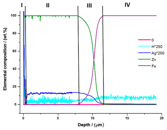 GD-OES analysis was performed to obtain information on the composition and distribution of the elements through the thickness of the Zn/AgP composite coatings formed under different conditions. Figure 3 shows the typical profile of the distribution of the elements as a function of the thickness of a Zn/AgP composite coating. For clarity, the H and Ag signals were multiplied by 250. Four regions can be observed in the figure. In the first region, in the depth range from 0 to 0.5 µm, which corresponds to the surface of the coating, the presence of O and Zn is observed. The presence of oxygen on the surface of the coating is indicative of the formation of a surface oxide film. Additionally, a high percentage of Ag is observed and can be associated mainly with an excess of Ag that adhered to the surface after the electrodeposition process and that was not eliminated during the subsequent rinse. After removing the surface oxide film, the second region is observed in the depth range of 0.5 to 7.5 µm, corresponding to the Zn/AgP composite coating. In this region, Zn (~99%), Ag (~0.03%) and H (~0.02%) signals are observed and exhibit a similar and constant behaviour throughout the region; this outcome is indicative of a uniform distribution of these elements throughout the thickness of the coating, as well as the simultaneous co-deposition of Zn and AgP to form the Zn/AgP composite coatings. Subsequently, in the approximate range of 7.5 to 11.5 µm (third region), the growth of the Fe signal (substrate) is observed, as well as the simultaneous decrease of the Zn and Ag signals, indicative of the formation of an interface between the substrate and the coating. At depths greater than 11.5 µm (fourth region), there is a constant signal of the Fe substrate (~100%), indicating that the substrate has been reached. A similar behaviour, but with different signal intensities, was observed for all of the obtained coatings (Figure S3 additional information). Unlike the EDX results, which show only the surface presence of the elements and not their distribution inside the coatings, the results obtained by GD-OES confirm the homogeneous occlusion of AgP throughout the thickness of the coatings and complement the results obtained by EDX.