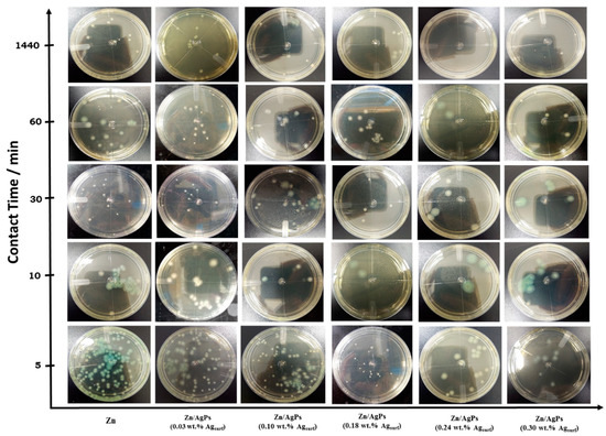 One of the potential applications of Zn/AgP composite coatings is their use as a protective coating of implants or prostheses, which is why it is important to evaluate their bactericidal activity with respect to bacteria that cause internal infections. Nosocomial and post-operative infections caused by the Gram-negative bacteria P. aeruginosa are recognized as an acute problem in hospitals due to their intrinsic resistance to many antibiotics [28,37,38]. In this work, the antibacterial activity of the Zn/AgP composite coatings with different AgP contents, occluded in their metal matrix, was evaluated against P. aeruginosa bacteria during different contact times: 5, 10, 30, 60, and 1440 min, following the methodology described in Section 2.3. The results obtained (Figure 4) show that by increasing the content of Ag in the Zn/AgP composite coatings and the contact time, the bacterial growth decreases considerably.
