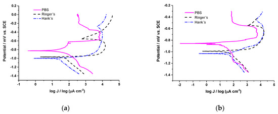 Polarization curves obtained from (a) Zn coatings and (b) Zn/AgPs (0.30 wt.% Agsurf) in different physiological solutions.