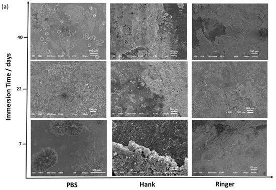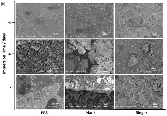 Figure 7 shows the SEM images obtained from the Zn (Figure 7a) and Zn/AgP (0.30 wt.% Agsurf) coatings (Figure 7b) after immersion for the different times. In each solution, both coatings had a similar superficial appearance. In PBS, after 7 days of immersion, the presence of crystalline structures was observed on the surface of both coatings. The elemental mapping of the surface (Figure S4a, additional information) shows that these crystals are formed of P and O, which cover the surface of Zn, forming a protective film. These results corroborate the formation of a passivating film observed in the polarization curves in PBS. The formation of an insoluble phosphate film can be attributed to the presence of hydrogen phosphate in PBS, which reacts with the dissolved Zn2+ ions during the corrosion process and forms insoluble Zn-phosphate species. Additionally, after 40 days of testing, the surface of the sample was completely covered by the protective film. Importantly, at the end of the test, the formation of precipitate in the solution was not observed.