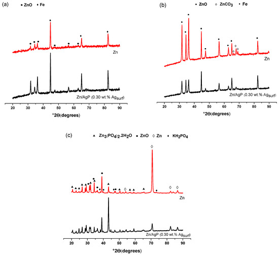 A similar behaviour was observed in the XRD diffractograms obtained from the Zn and Zn/AgP (0.30 wt.% Agsurf) coatings immersed in Ringer’s solution (Figure 8b). However, in addition to the ZnO and Fe signals, signals associated with ZnCO3 were observed due to the interaction of Zn2+ ions (dissolved during corrosion) and CO32- ions that are present in Ringer’s solution under alkaline conditions.