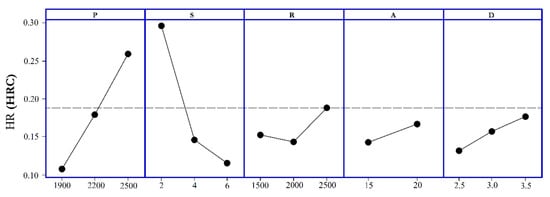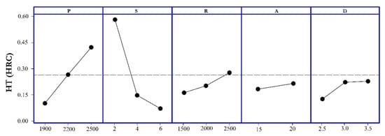 23]. The five factors that are used in these experiments are laser power (P), scanning speed (S), rotation speed (R), flank tilt angle (A), and tooth depth (D).