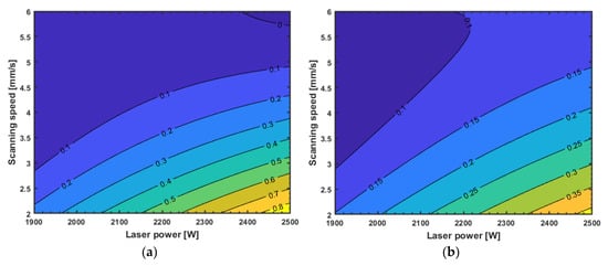 25] as a function of laser hardening process parameters is performed to obtain a more clear understanding of the estimated model responses. The sensitivity study is established to explore the effects of the laser hardening process parameters on the hardness profile. In fact, the response surfaces present contour plots of case depths at the tip and root of a splines’ tooth with respect to the variation of the process parameters.