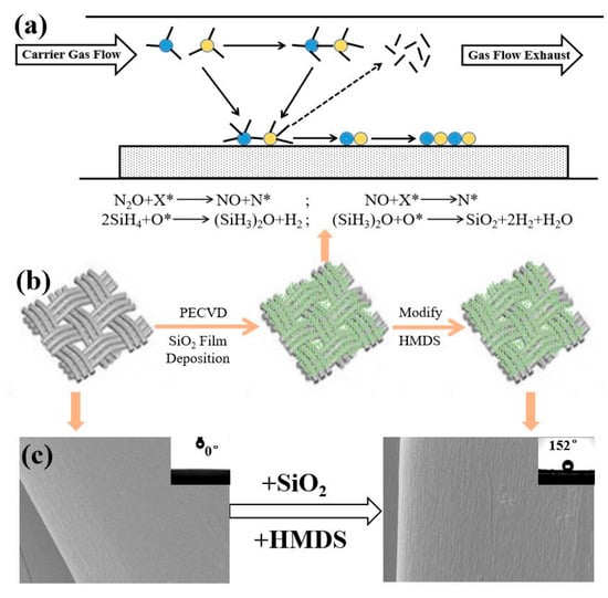 Although these studies have made some success in the field of preparing UV resistant silk fibers, the above methods, in many cases, are hardly able to form a stable coating structure, resulting in them being easily exfoliated from the surface of SF and, additionally, resulting in a deterioration of the superhydrophobic and anti-UV performances. Meanwhile, plenty of UV shielding agents can produce hydroxyl radicals and superoxide radicals under the UV light, owing to their high photocatalytic activities [13]. Given their strong oxidation properties, the radicals will damage the structure and composition of fibers/fabrics after they are further transmitted to the interface between UV shielding agents and fibers. PECVD is an effective conformal coating technology, which has the advantages of good uniformity, accurate thickness control, and strong adhesion. PECVD is a technology that uses glow discharge to ionize thin gas in a high frequency electric field to produce plasma. These ions are accelerated in the electric field to obtain energy, which can lead to the growth of thin film at low temperature [14]. SiO2 is the most favored inorganic material and has been widely applied because of its excellent chemical stability, mechanical strength, and high transparency [15]. In this work, SiO2 was coated onto silk fabric by PECVD, and a robust superhydrophobic SiO2@silk fabric was further constructed by HMDS modification. The modified silk fabrics exhibited excellent superhydrophobicity and anti-UV properties. Moreover, the chemical and laundering durability of the finished silk fabrics will be discussed in detail. In general, this method is considered to be a promising way to produce high-end fabric. It shows promise for the design of multifunctional fiber materials in the future.
