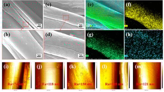 Figure 2a–d shows the FE-SEM images of SF and SF-5SiO2. As shown in FE-SEM images, it can be seen that the surface of the bare silk fabric is very smooth (Figure 2a,b). In contrast, many dense cracks and a few particle clusters can be observed on the surface of SF-5SiO2 (Figure 2c, d), which may be attributed to the aggregation of neighboring SiO2 nanoparticles. The absence of cracks indicates that the SFs are completely covered by SiO2 layers. The energy dispersive X-ray (EDX) analysis shows that there is a continuous, uniform and dense SiO2 coating on the surface of SF-5SiO2 (Figure 2e–h). Figure 2j–m shows that the arithmetic average roughness (Ra) measured was 118, 158, 125, and 121 nm for the SF-nSiO2 subjected to 2.5, 5, 7.5, and 10 min PECVD deposition, respectively. However, the Ra of bare silk fabric was only 74 nm (Figure 2i), which indicated that the SiO2 coating prepared has a certain surface roughness. After the deposition of SiO2 coating, the surface roughness of silk fabric increases. However, Ra is not a monotonic function of the PECVD exposure time. It reaches a maximum at around 5 min before it decreases, since silica further fills some of the grooves (weaving) on the surface of the silk fabric.