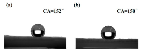 The water contact angles of the SF-nSiO2 were measured by using an OCA2.0 contact angle measurement system at 20 °C with a 5 μL water droplet. The contact angles were measured using the drop method at 5 different points on each sample. When water drops on the surface of silk fabric, it can be completely wetted; on the contrary, the surface of the modified silk fabric shows the superhydrophobicity with water contact angles (WCAs) of 152° (as shown in Figure 3). Superhydrophobic surfaces are improved by increased surface roughness. This is completely consistent with the theory that was originally reported [20,21]. To evaluate the stability of the wetting properties after UV exposure, the contact angles of SF-5SiO2, before and after UV light treatment for 30 min, were measured and shown in Figure 4a,b. After UV irradiation, the wettability of the SF-5SiO2 was almost unchanged (Figure 4b). And it exhibits excellent surperhydrophobicity with WCAs of 150°, which indicates the wettability of the SF-5SiO2 has a strong tolerance to UV light. It is very important to endow the surface of silk fabric with the superhydrophobic property for stain resistance.