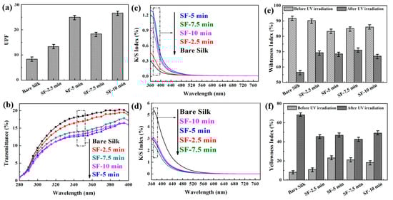 (a) UPF values of SF and SF-nSiO2; (b) Ultraviolet transmission spectra of SF and SF-nSiO2; Color strength indicator, K/S value of SF and SF-5SiO2: (c) without UV irradiation, (d) with UV irradiation for 30 min; (e) whiteness index, (f) yellowness index of SF and SF-5SiO2 before and after UV irradiation for 30 min.