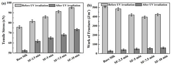 In addition, the mechanical properties of materials are important for evaluating their practical applications. It is necessary to improve the mechanical properties of silk fabrics as they are very easily damaged. Thus, we applied tensile tests to all samples before and after UV irradiation for 30 min, and the average values for tensile stress and work fracture of all samples are given in detail in Figure 6a,b. To obtain accurate results, the values of tensile stress and work fracture of all samples were measured 10 times to obtain an average value. It is clearly seen that the values of tensile stress and work fracture of SF-nSiO2 are higher than that of bare silk. Moreover, the large increase in tensile stress and work fracture indicates that SiO2 can enhance the mechanical properties of silk fibers.