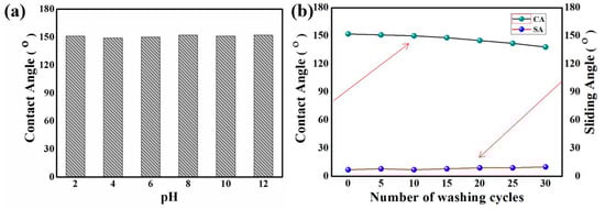 For functional textiles, the contradiction between excellent functional characteristics and long-term durability and stability has always been a problem difficult to solve by scholars. Up to now, research progress has been unsatisfactory, especially for protective textiles with special functional coating. When these textiles, with special functional surfaces, contact with each other or with other substances outdoors, the functional coatings on their surfaces will wear to varying degrees due to sunlight, friction, or other external forces. They might also completely lose their functions, resulting in the failure of functional fabrics, which greatly limits the practical application and development of functional fabrics. The chemical stability and laundering durability are also key factors in determining the application of functionalized fabrics. Therefore, we have evaluated the chemical durability of SF-5SiO2 by soaking it in different pH solutions for 6 h, and it maintained excellent superhydrophobic properties, which indicated that the finished silk fabric has excellent chemical stability (Figure 7a). In addition, the SF-5SiO2 was washed for different cycles according to the method of American Association of Textile Chemists and Colorists 61-2006 methods. The WCAs and WSAs of all samples were measured. After 30 cycles of repeated washing, the SF-5SiO2 remained superhydrophobic (Figure 7b), which might be due to the formation of a stable chemical bond between the SiO2 coating and the silk fabrics.