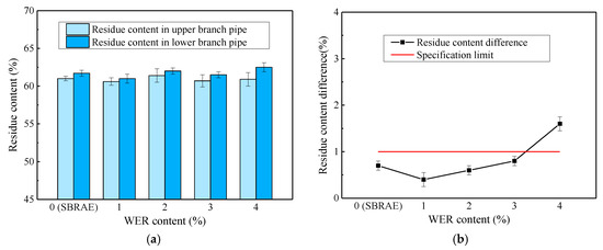 Figure 1a shows that the residue content in the lower branch pipe was larger than that in the upper branch pipe, which may be due to the slightly higher density of asphalt particles compared to water, resulting in the settlement of asphalt particles under the action of gravity during storage [24]. The residue content difference between the upper and lower branch pipes in the test tube was used to characterize the storage stability of the asphalt emulsion. Usually, a smaller residue content difference means better storage stability. In Figure 1b, the residue content differences of the WESAE with 1% and 2% WER were lower than that of the SBRAE. This indicates that the addition of WER can improve the storage stability of the SBRAE, but the amount needs to be limited to within a certain range. The improvement of the storage stability is attributable to the following fact [25]. When the amount of WER is lower, fewer flocculates are formed by crosslinking reaction between the WER and the curing agent; these can be evenly dispersed in the emulsion, increasing the viscosity. The increase of viscosity limits the Brownian motion of molecules, thereby improving the storage stability of the emulsion. However, when the WER content is higher, the flocculates increase and precipitate at the bottom of the test tube under the action of gravity, degrading the storage stability of the emulsion. In addition, when the content of WER reaches 4%, the one-day storage stability of the WESAE exceeds the specification limit [26], indicating that the amount of WER should not be more than 4%.