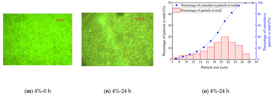 To gain an insight into the storage stability of the WESAE from a microscopic perspective, a fluorescence microscope test was conducted to observe the morphology and particle distribution of the WESAE with various WER contents. Figure 2 presents the micromorphology photos of the WESAE and SBRAE at storage times of 0 and 24 h, and presents the particle size distribution of the WESAE and SBRAE after 24 h storage.
