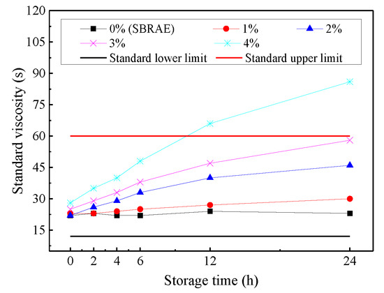 In order to analyze the workability of the WESAE binder with various WER contents, the WESAE was stored for different time periods and then its standard viscosity at different storage times was measured following the standard viscosity test. Figure 3 shows the viscosity variation values for the WESAE and SBRAE with storage time.