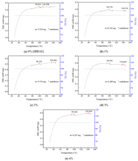 As can be seen in Table 4, for the WESAE residues, the second temperature peak increases from 110 to 140 °C, which means that the addition of WER increases the phase change temperature for the SBRAE residue, thus improving its thermal stability. All the WESAE residues show melting endothermic peaks at around 99 °C and near 140 °C for the amine substance, which indicates that all the WESAE residues have similar physical thermal stability values. Furthermore, according to the variation of the thermo-gravimetric curve with temperature in Figure 5, it can be seen that the chemical properties of each sample are stable and that there is no weight loss caused by thermo-oxidative decomposition with the increase of temperature. In addition, the addition of WER reduces the enthalpy per unit mass (see Table 4). The enthalpy per unit mass of the WESAE residue with 3% WER is reduced by more than 50% compared with that of the SBRAE residue, indicating that 3% WER greatly reduces the temperature sensitivity of the SBRAE residue and endows it with good thermal stability.