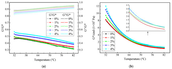 G′/G*, G″/G*, and G*/sinδ of the evaporation residues for WESAE and SBRAE at different temperatures: (a) changes of G/G* and G″/G*; (b) changes of G*/sinδ.