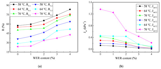 Creep recovery rate R and unrecoverable creep compliance Jnr of evaporation residue of the WESAE and the SBRAE: (a) changes of R; (b) changes of Jnr.