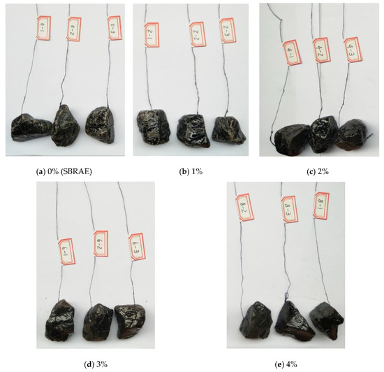 Adhesion between the WESAE, SBRAE, and the coarse limestone aggregate was first measured according to the adhesion test. Next, the sample images were taken, as shown in Figure 8. The calculation results for the spalling rate α of the asphalt film are shown in Table 5.