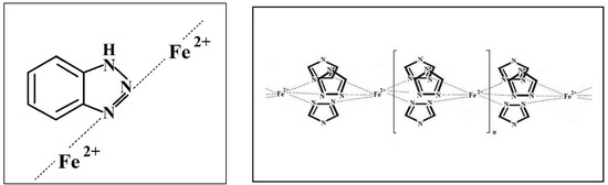 - Rubio, M.; Hernandez, R.; Nogales, A.; Roig, A.; Lopez, D. Structure of a spin-crossover Fe(II)-l,2,4-triazole polymer complex dispersed in an isotactic polystyrene matrix. Eur. Polym. J. 2011, 47, 52–60. [Google Scholar] [CrossRef]