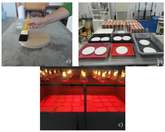 The test conditions, which represent extreme climate conditions, were adapted from EN 1015:21 [33]. This methodology was also validated in previous research by the authors [34,35]. Hot-cold cycles consist of storing the specimens firstly within a closed apparatus with infrared lamp (Figure 1c), which provides high temperature, and later within a deep-freeze cabinet with low temperature. Freeze-thaw cycles were carried out by exposing the specimens to a sprinkler system (simulating rain), followed again by a storage within a deep-freeze cabinet. Hot-cold and freeze-thaw cycles were carried out sequentially on the same specimens. Eight cycles of each type were performed, improving the indications (four cycles) of the norm previously mentioned (Figure 1c). Further details on the weathering cycles are provided in Table 3.