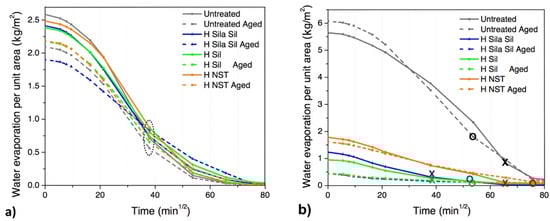 Drying curves for the sound, treated and aged substrate of (a) limestone and (b) mortar, where the dotted lines are the aged specimens, and solid lines the unaged specimens. The dotted ellipse (a) identifies the end of the 1st step of drying (critical moisture content) in (a), whereas this spot is highlighted as X (unaged specimens) or O (aged specimens) in (b).