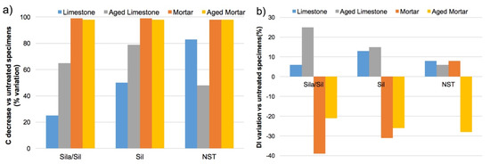Percentage variation of (a) capillary water absorption coefficient (C), (b) drying index (DI) and (c) diffusion resistance of the water vapor coefficient (µ) of treated specimens, before and after artificial aging, when compared to untreated specimens.