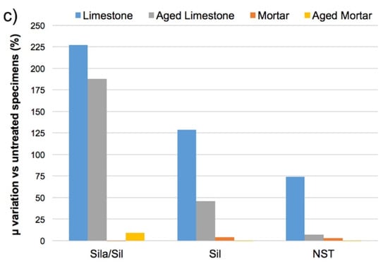This reduction is more significant in limestone specimens, whereas it is almost negligible in mortar specimens. In fact, an increase of µ of 227% (HSila/Sil), 129% *(HSil) and 74% (HNST) is observed on treated limestone specimens, when compared to untreated ones, whereas a minimal µ increase (<4%) is observed on the treated mortar specimens.