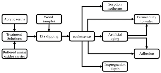 The treatment solutions with amine oxides contained 46.67 g of the 30% amine oxide solutions (14 g of AO) and 1.75 g of both boric acid and sodium tetraborate. The solutions with an acrylic resin were prepared by adding the appropriate amount of resin to reach the final resin content desired. The resin content of each solution was chosen to obtain a dry film thickness around 50 μm and was determined with preparatory essays following the standard ASMT D5235-18 [39]. Because thicker films were obtained from the solutions with Encor® DT 100, the resin content was adjusted accordingly. Every solution contained 5.6 g of Tilt 250E (1.4 g of propiconazole). Water was added to bring the solutions to a total mass of 700 g. For the impregnation depth test, 100 g of the same solutions were prepared, where propiconazole was replaced with indigo. The experimental procedure of the study is described in Figure 1, the composition of the treatments is shown in Table 3, and the treatments used for each test are found in Table 4.