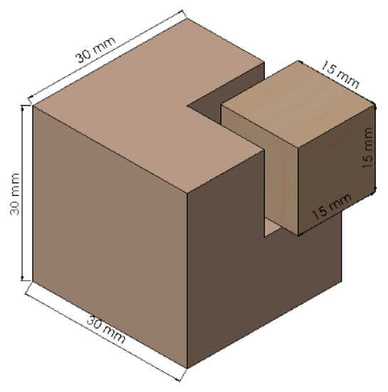 The impregnation depth of the propiconazole was visually estimated with an indigo blue dye. Although the penetration depth of the two chemicals is not expected to be exactly the same, the use of a dye with a similar structure to propiconazole should allow a practical and reliable method to study the distribution of the fungicide into wood. Samples with dimensions 30 mm × 30 mm × 30 mm were treated with solutions containing the indigo dye instead of propiconazole. They were then cut to 15 mm × 15 mm × 15 mm from one of the corners to view the impregnation in the three principal planes (Figure 2). The penetration of the dye was observed with an Olympus SZ61 stereomicroscope (Tokyo, Japan) with a 40× magnification and measured with a Velmex micrometer (Bloomfield, NY. USA) to a ± 2 mm precision.