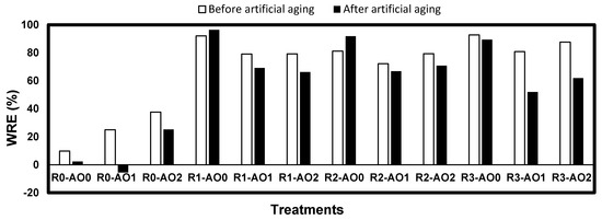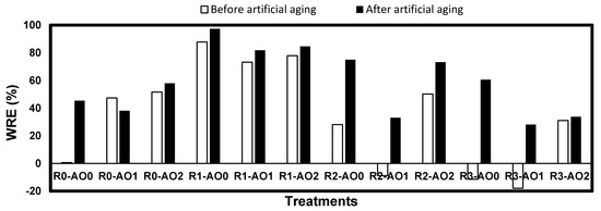 The acrylic resin*aging interaction was also very significant, particularly in white pine (F = 59.24), since most coated samples resisted cracking. This led to large increases of their WRE after aging, particularly in R2 and R3, as their WRE was very low before aging. In the case of white spruce, the interaction comes from the large decrease of WRE in R3-AO1 and R3-AO2 after aging, which were much more cracked than samples treated with the same amine oxides conditions under R1 and R2.