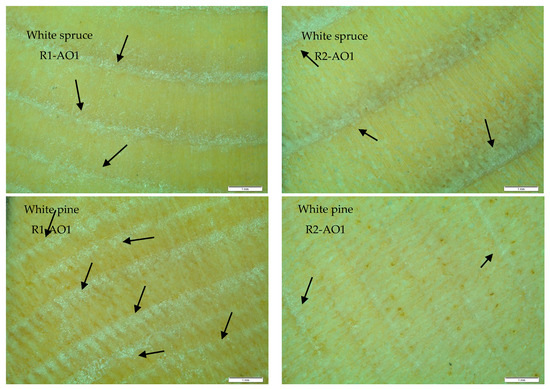 Optical microscopy of the transverse plane of white spruce and white pine treated with R1-AO1 and R2-AO1. The arrows indicate the presence of resin at the surface of the latewood.