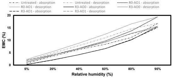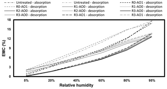 While the coatings did not reduce the EMC, they did slow down the uptake of water, particularly at 95% RH. In average, each absorption step was about 1 h longer for coated pine samples than the uncoated ones, and 30 min longer in white spruce, whereas it was 4 h longer to reach equilibrium at 95% RH for both species. On the other hand, the rate of desorption was just slightly slower in the coated samples for both species. The only exception was treatment R3-AO0 on white pine, which absorbed and desorbed at the same rate as the uncoated samples, except at 80% and 95%, showing an analogous behavior to its liquid permeability.