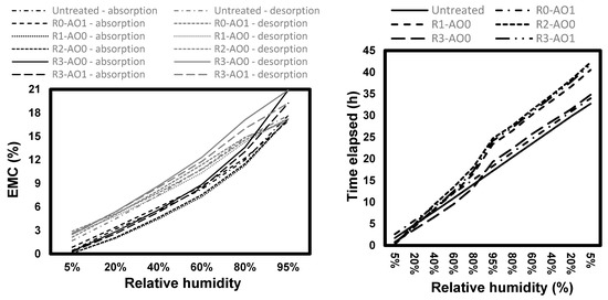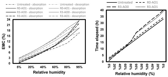 Equilibrium moisture content (EMC) of the samples before (top) and after removing the mass of the coatings (left), and time elapsed after reaching the equilibrium (right) at the different steps during the sorption isotherms in white spruce.