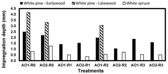 The impregnation depth of the indigo dye is shown in Figure 9. In the case of the white pine, the penetration of the indigo from the treatment solutions without a resin was fairly deep in the earlywood and slightly deeper in the latewood, while it only penetrated in the earlywood of the white spruce. This difference was attributed to the radius of the latewood tracheids of the two species [36]. Since the samples are impregnated without pressure, the capillary forces in the lumen become critical to allow the treatment solutions into the wood. The radius of the lumen, which is heavily connected to the capillary forces (r4) [70], is much smaller in the white spruce than the white pine, and insufficient to allow the penetration of the solution. The deeper penetration in the latewood of the white pine than its earlywood was attributed to its thicker and stiffer cell walls, which reduce the nonlinear flow of the solution and the aspiration of the wood pits, allowing a deeper penetration [59,60]. No impregnation was observed perpendicularly to the grain, as the indigo loaded amine oxide micelles may be too large to penetrate the radial pits.