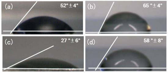 Figure 1. Contact angle of the water–stainless steel surface: (a) control, (b) ODPA-SAM-modified samples, (c) HOOC-DPA-SAM-modified samples, and (d) polyamine-tethered HOOC-DPA -SAM-modified samples.