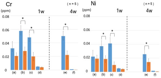 Figure 2. Concentration of the eluted metal ions from the ODPA-modified dental wire immersed in (a) 0.05 M HCl, (b) 0.1 M H3PO4, (c) 1 M lactic acid, (d) 0.1 M lactic acid for one week, (e) 0.1 M lactic acid, (f) saline for four weeks; left: Cr ions, right: Ni ions. (p < 0.05).
