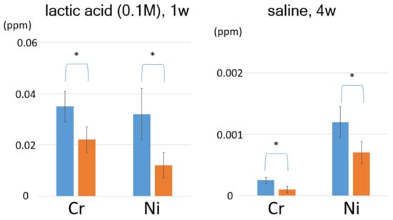 Some metal ions in stainless steel, such as Cr, Ni, and Pb, cause metal allergies [13,14,15,16]. In the dental field, metal allergies constitute a delayed type of allergy classified as type IV [17]. These are attributed to incomplete antigens formed by the binding of Ni and Cr ions with proteins in the oral environment [18]. Therefore, selecting a stainless steel wire in orthodontic treatments sometimes requires a metal allergy check. To this point, suppressing the elution of these ions may reduce metal allergy risk.
