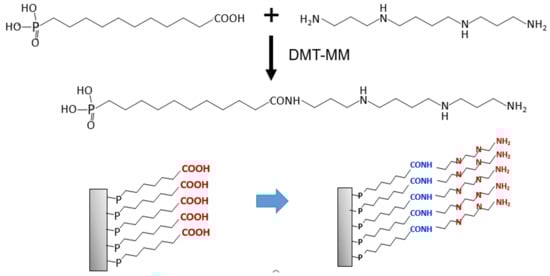 To tether the polyamine on the stainless steel surface, the cleaned bare stainless steel was initially modified using HOOC-DPA. The obtained wire was subsequently modified using –COOH at the end of the SAM and by immersing it in 10 mM polyamine/dehydrated ethanol solution, accompanied by stirring for 2 h. Furthermore, 1.2 eq. of DMT-MM was added to the reaction mixture to enhance amide bond formation. This procedure was consistent with our previous studies [27], but with some minor modifications.