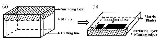 The composite material with 10 mm thickness is longitudinally cut (the cutting line in Figure 1a by wire-electrode cutting after treatment with low-rate cooling. The composite is then longitudinally cut with a wire-electrode with cutting thickness of 10 mm. The chip composite after cutting is the prototype of the cutter blank. As shown in Figure 1b, the surfacing layer part can be used as the cutting edge and the matrix part can be used as the blade. Samples are taken at the interface of the surfacing layer and the matrix by wire-electrode cutting. The samples, measuring 10 mm × 10 mm × 10 mm, were used for optical microscope (OM) observation, scanning electron microscope (SEM) observation and electrochemical corrosion test. The samples with dimension 55 mm × 10 mm × 10 mm were used for impact testing. The sampling position is shown in Figure 1b.