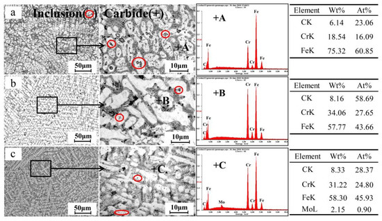 Microstructure and morphology of different surfacing layers and the energy-dispersive X-ray spectroscopy (EDS) energy spectrum of carbide. (a) 5Cr13; (b) 8Cr13; (c) 8Cr13MoV.