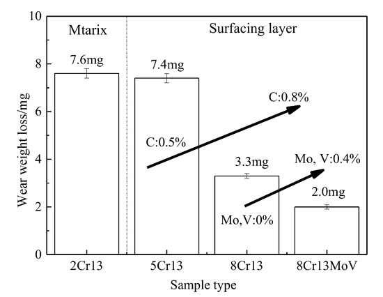 where K is the coefficient, H is hardness, W−1 is wear resistance. Equation (3) indicates that the higher the hardness of the material is, the less the wear damage of the abrasive particles is to the surface layer, the smaller is the degree of abscission and deformation, and the better is the wear resistance. Among the three types of surfacing layer, the hardness of the 8Cr13MoV surfacing layer is highest (Figure 7). Therefore, the wear resistance of the 8Cr13MoV surfacing layer is optimal, and compared with the matrix, it increased about 4 times.