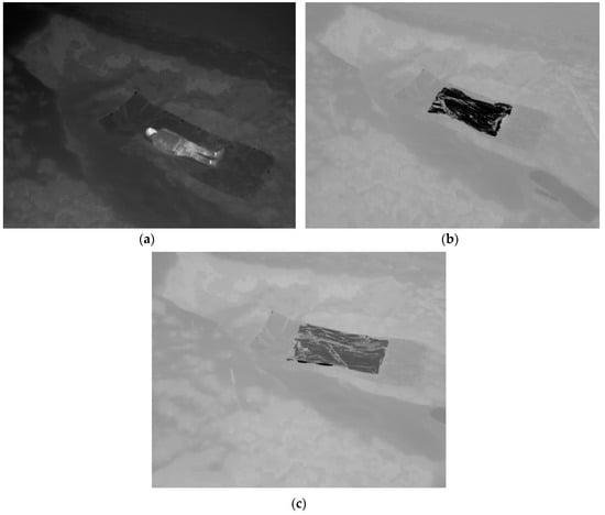 Accurate temperature measurements depend on many factors including, E and R from objects and T from the atmosphere []. Detection of IR radiation within the wavelength-range of 6000 to 15,000 nm (mid- to far IR), using thermal cameras, is based on emission, transmission and reflection. Temperatures between −10 and 200 °C give off no radiation that is visible to the naked eye other than what is reflected. Glass does not allow transmission of radiation in the range of 8000 to 12,000 nm. As E from an aluminum layer is negligible, most of the radiation from a metallized rescue blanket will actually be reflected radiation from the environment. Radiometric measurements from distances exceeding 100 m are influenced by atmospheric radiation. Remote temperature sensing using thermal cameras relies on the ability to accurately compensate for surface characteristics, atmospheric interference and the imaging system []. Imaging systems provide further adjustments with digital detail enhancement, active contrast enhancement, and high-gain mode with increased sensitivity to temperature differences [].