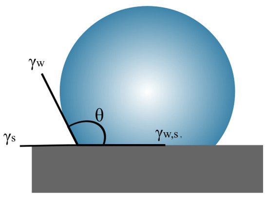 The theoretical relation between the water contact angle and ice adhesion is based purely on thermodynamic relations. These relations are described by Makkonen [36], and briefly reiterated here. We consider a drop of water (w) on a solid (s) with an interface (w,s) and the corresponding surface energies and droplet contact angle . The situation is schematically illustrated in Figure 1. We assume the Young contact angle, described by the equation
